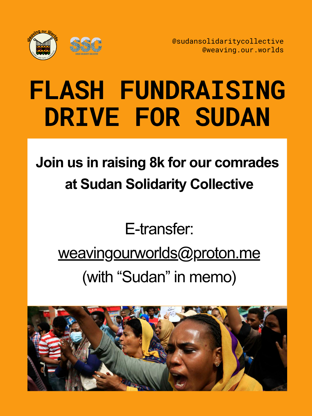 Etransfer weavingourworlds@proton.me With Sudan in memo. Collecting etransfers this way helps our comrades save on individual transaction fees and helps guarantee a goal for their coordination work on the ground.